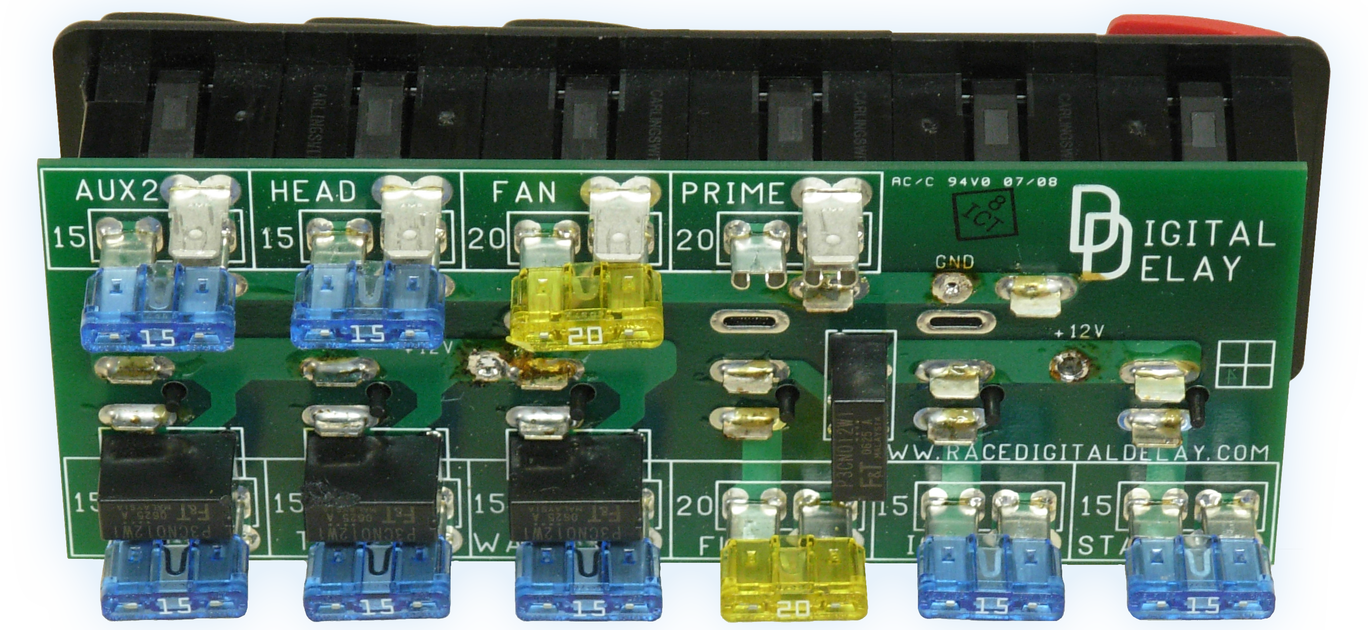 Sleek and compact. Designed to easily fit into a dragster's dash. Each output has its own fuse with push-on spade plugs to speed up wiring, with a 50-amp total load-rating that is the highest current rating for any stand alone Switch Panel.
